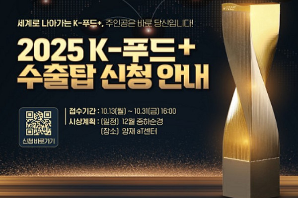 - 농식품과 농산업 수출 성과를 인정받을 기업을 찾는다. 억 달러 규모의 수출 강자에서 스마트팜·펫푸드 같은 신흥 분야까지 참여할 수 있는 ‘K-푸드+ 수출탑’이 올해 세 번째 공모에 들어가면서, 수출 확대에 기여한 기업을 격려하고 더 많은 기업이 도전할 수 있도록 문턱도 한층 낮췄다.. 농림축산식품부는 제3회 ‘K-푸드+ 수출탑’ 수상 기업을 10월 13일부터 31일까지 모집한다고 30일 밝혔다. 올해 시상 규모는 총 50개 기업으로 시상식은 12월 서울 양재동 aT센터에서 열린다. 수출탑은 수출 실적을 기준으로 하는 ‘수출탑’과